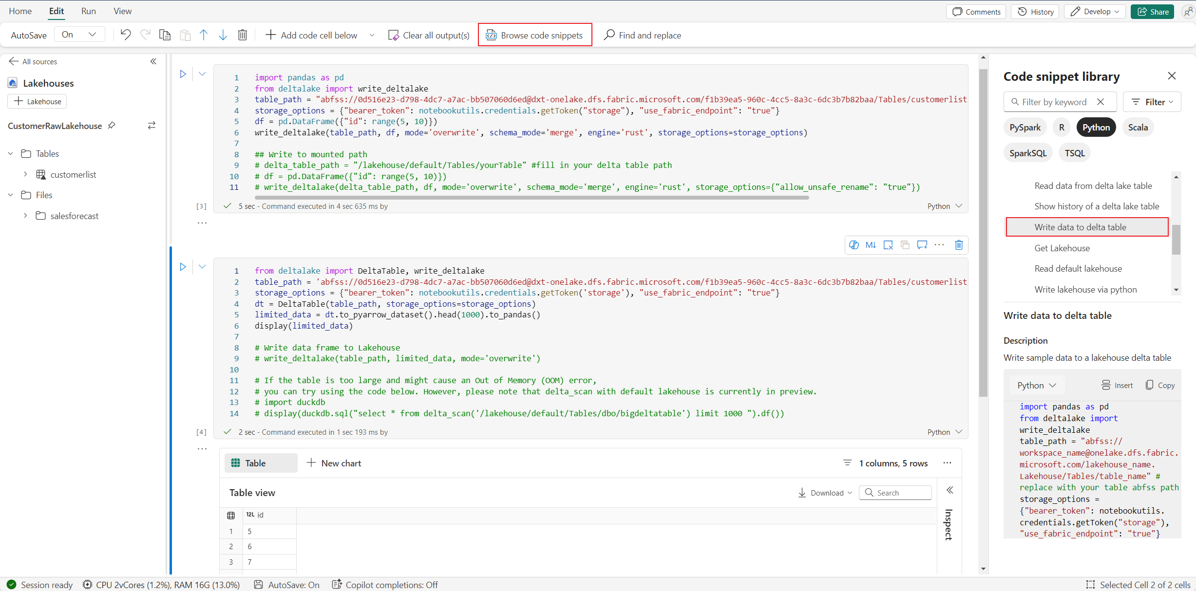 Lakehouse & Resources are natively available: The Fabric Lakehouse together with Notebook built-in Resources full functionality are available in Python notebook. This feature enables users to easily bring the data to python notebook, just try drag & drop to get the code snippet.