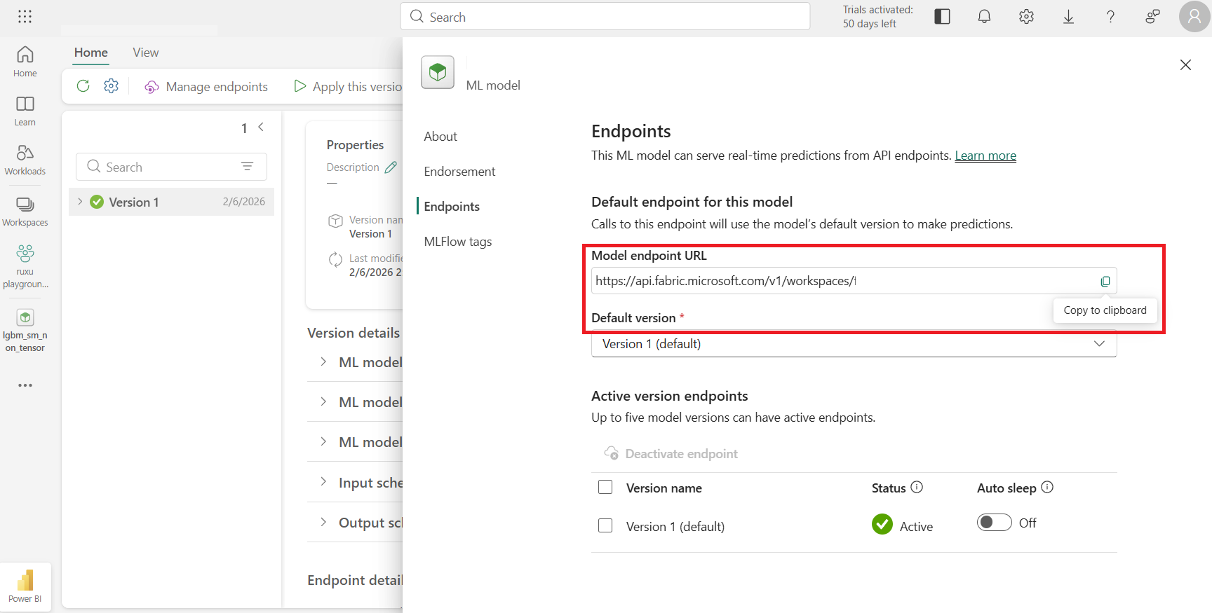 Endpoint URL: Navigate to your machine learning model in Fabric and copy the endpoint URL from the Endpoint details section.