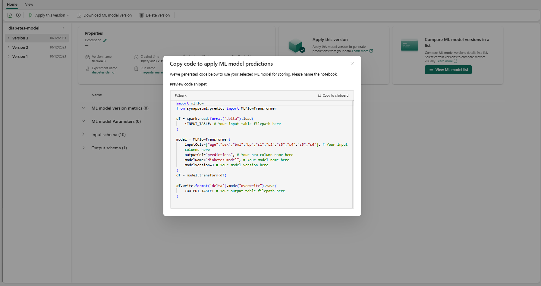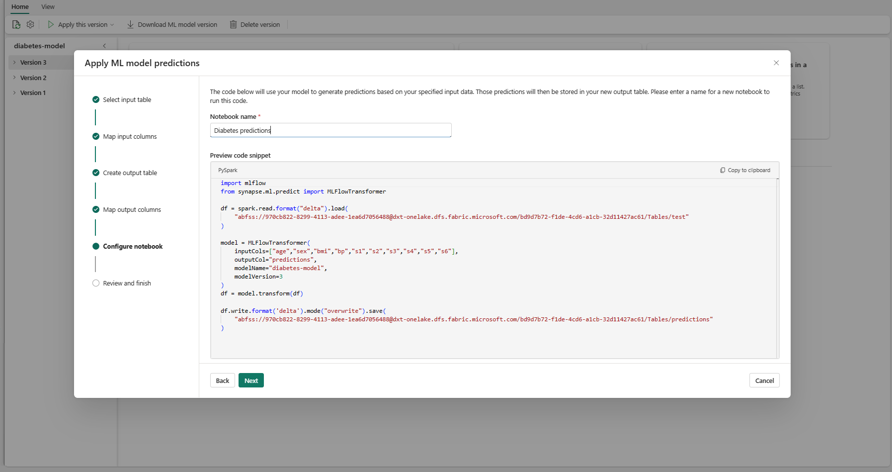 13. Review the details on the summary page, and select Create notebook to add the new notebook with its generated code to your workspace. You're taken directly to that notebook, where you can run the code to generate and store predictions.