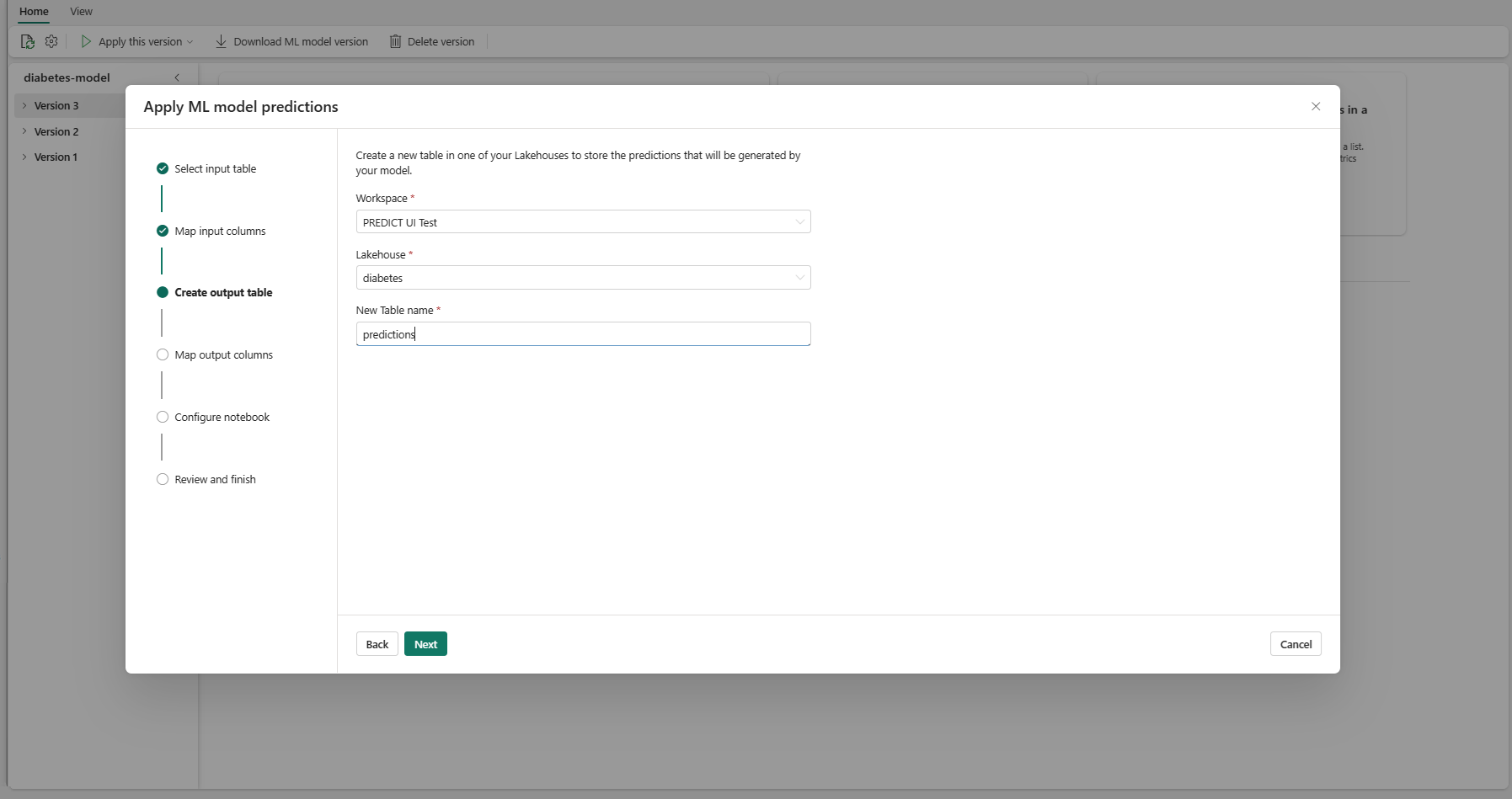Screenshot that shows the step that creates an output table for ML model predictions.