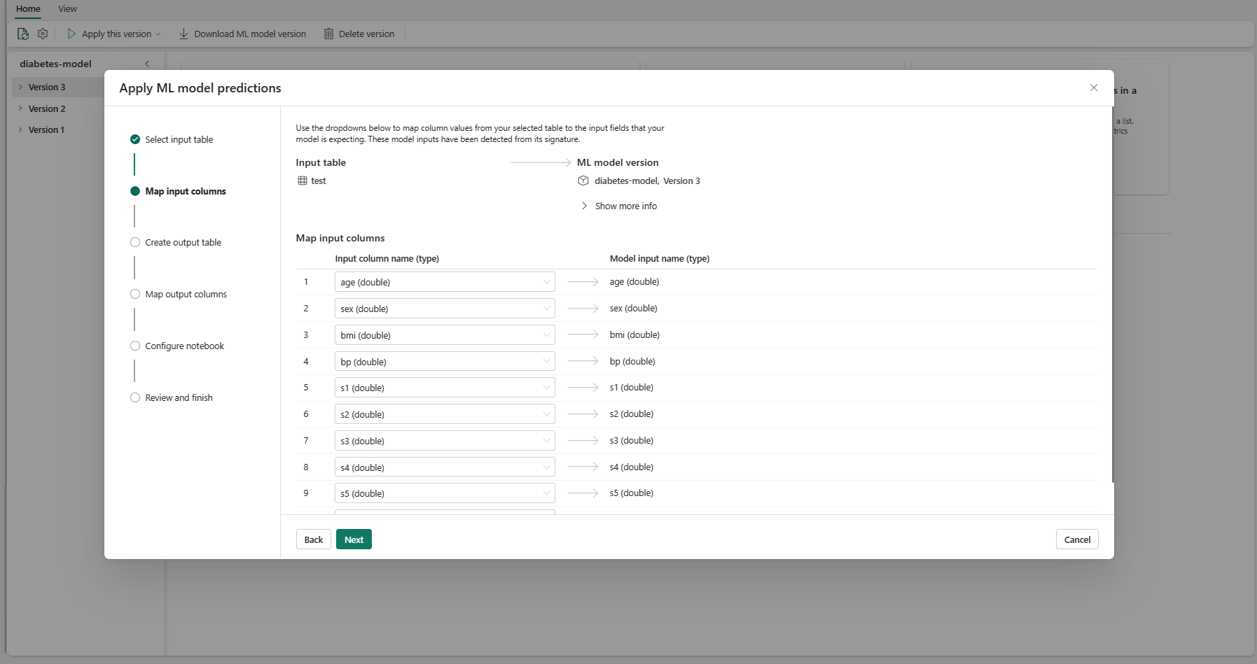 Screenshot that shows the step that maps input columns for ML model predictions.