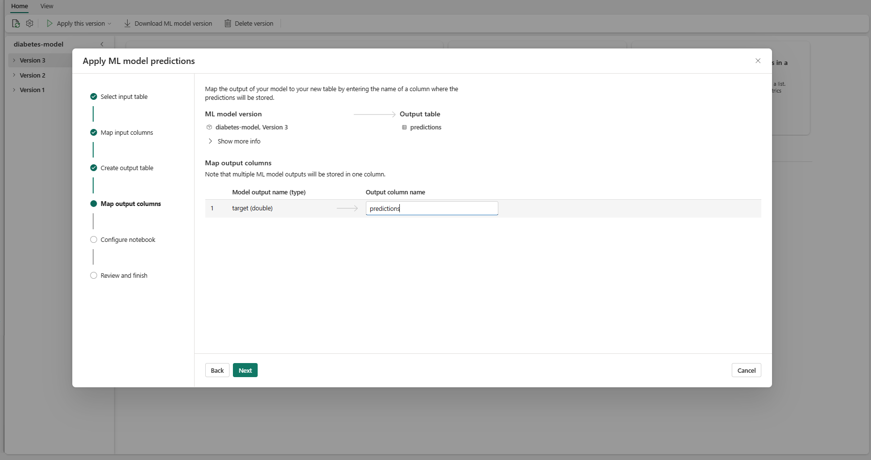Screenshot showing the step that maps the output columns for ML model predictions.