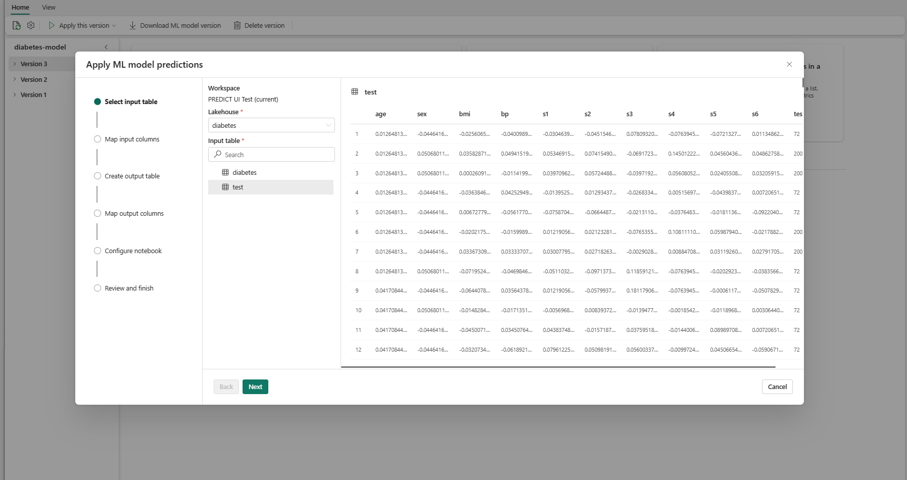 At the "Select input table" step, the "Apply ML model predictions" window opens.