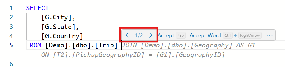 - Auto-complete partially written queries: Copilot can provide context-aware SQL code suggestions or completions for your partially written T-SQL query.