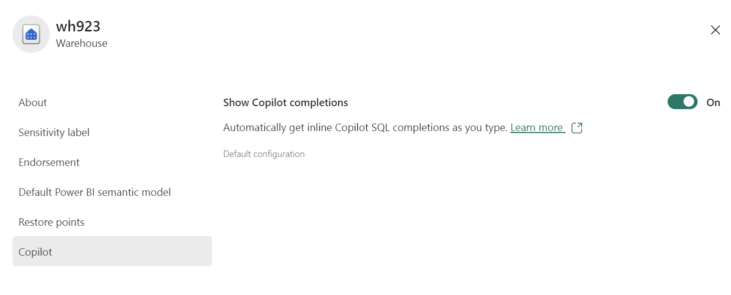 Verify the Show Copilot completions setting in enabled in your warehouse settings.