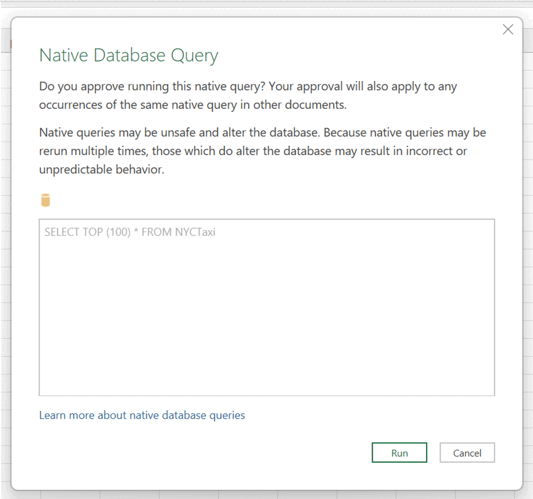 To see the data, select the Enable Editing button in the Protected View ribbon followed by the Enable Content button in the Security Warning ribbon. Once both are enabled, you're presented with the following dialog to approve running the query listed.