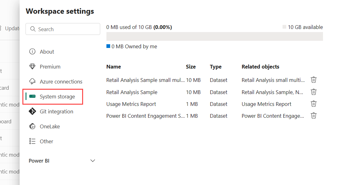 System storage is the place to manage your semantic model storage in your individual or workspace account so you can keep publishing reports and semantic models. Your own semantic models, Excel reports, and those items that someone has shared with you, are included in your system storage.