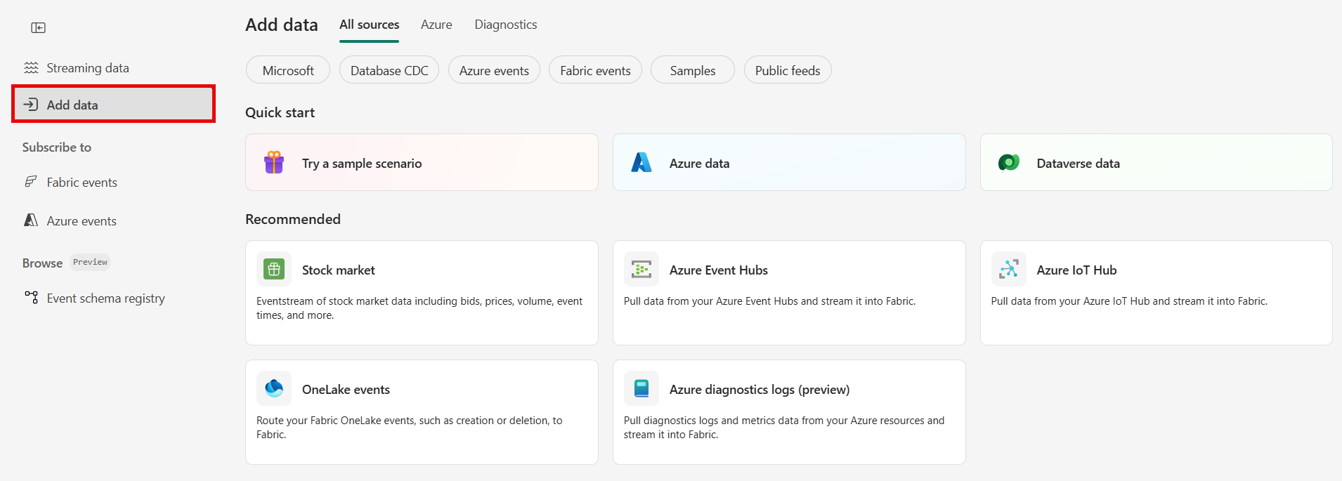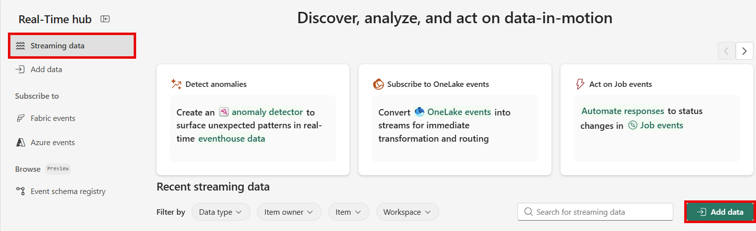 4. The Streaming data page opens by default. Click on the Add data button to get to the Data sources page.