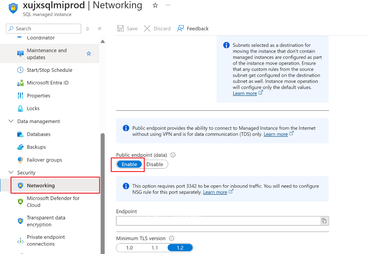 Go to the Azure portal, open your Azure SQL managed instance, select Networking, and enable public endpoint.