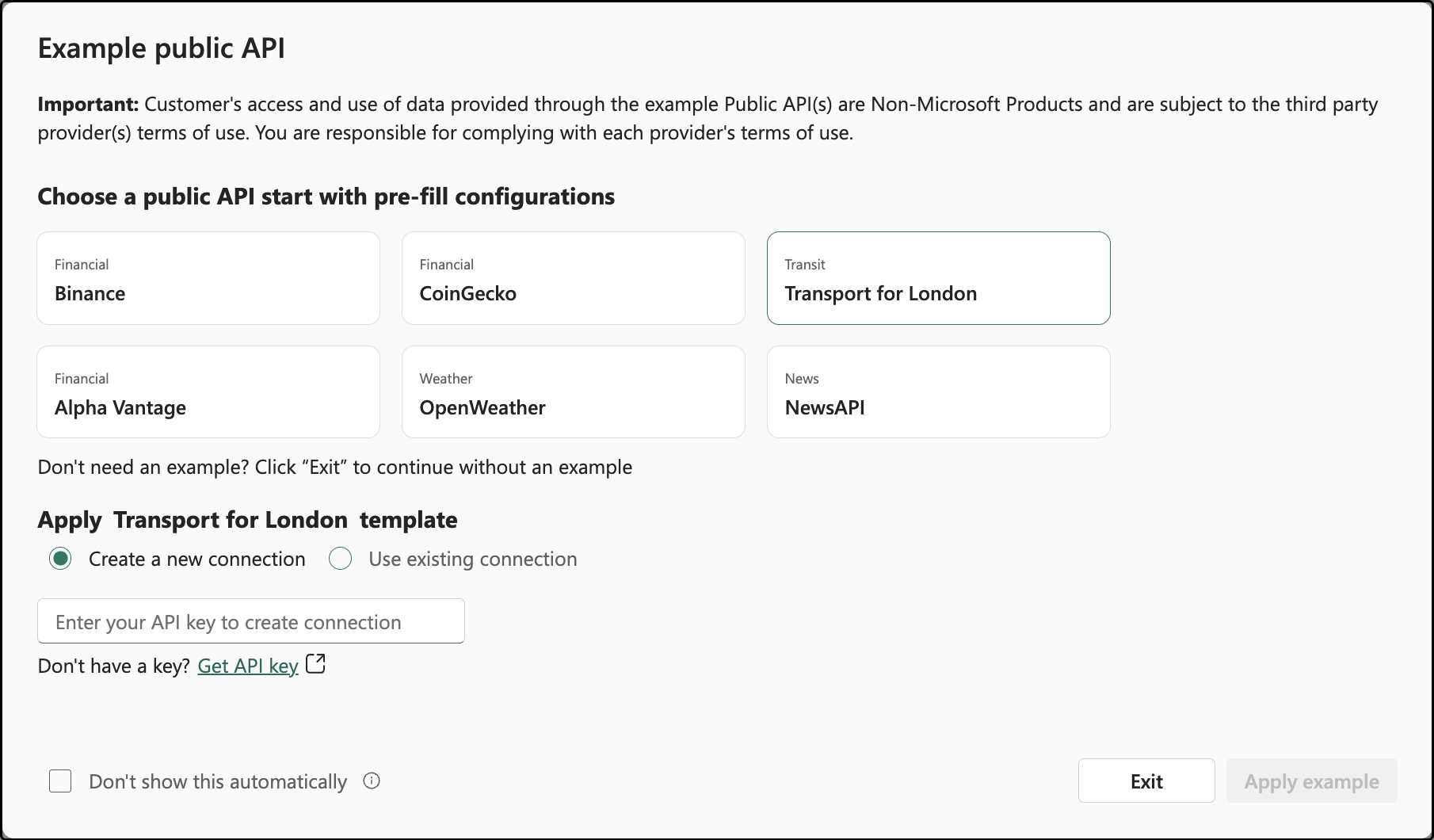 If you choose Use existing connection, select Apply example to prefill the required headers and parameters for the example API without entering an API key.