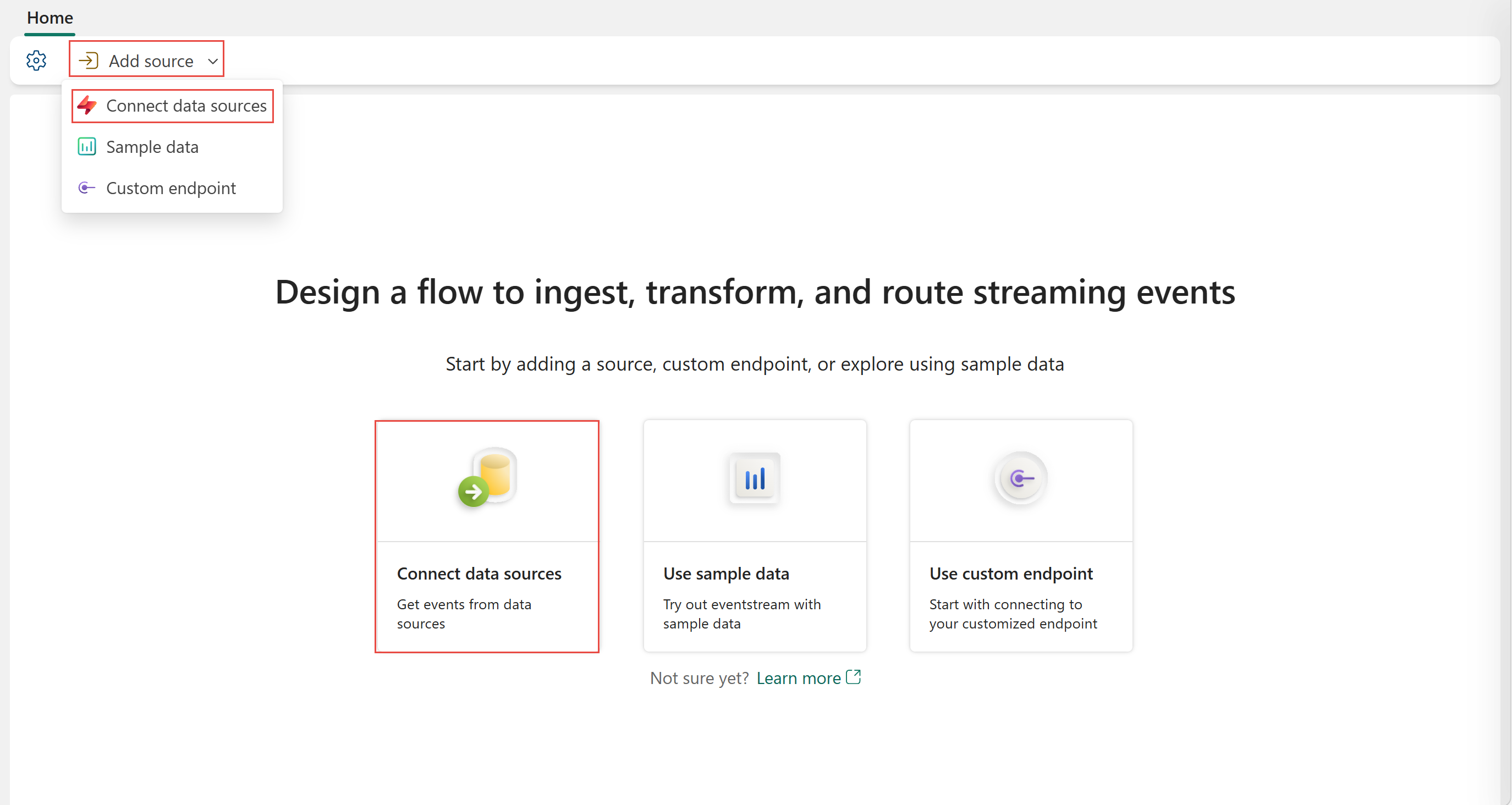 If you haven't added any source to your eventstream yet, select the Connect data sources tile. You can also select Add source > Connect data sources on the ribbon.