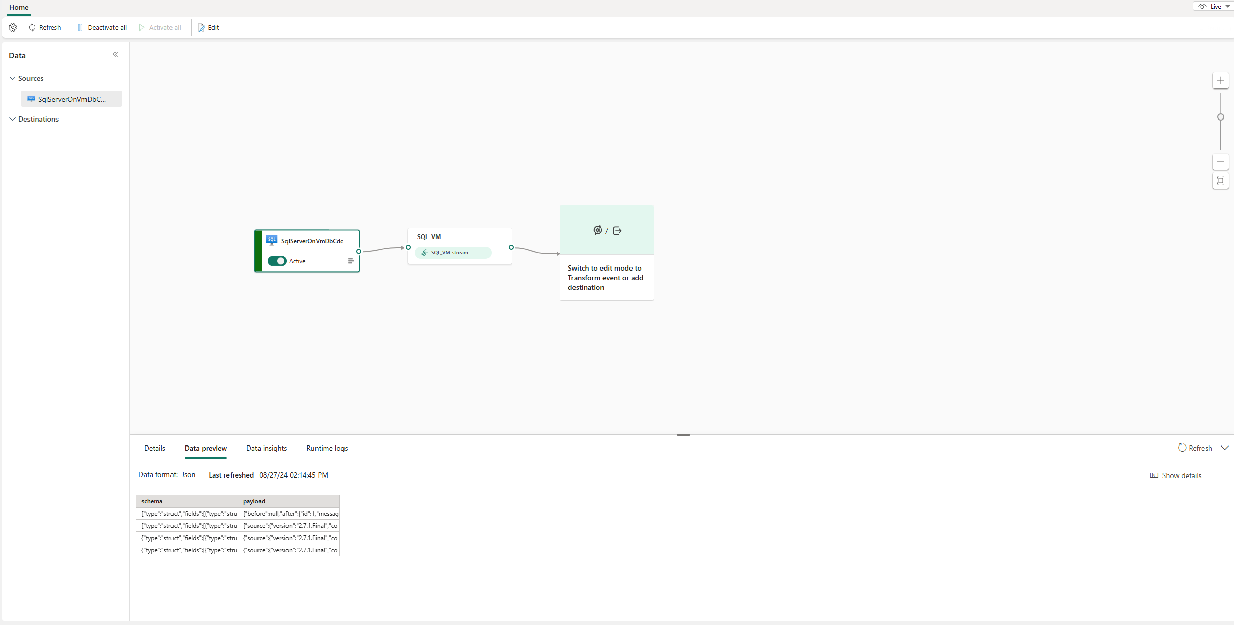 You can see the SQL Server on VM DB CDC source added to your eventstream in Edit mode.