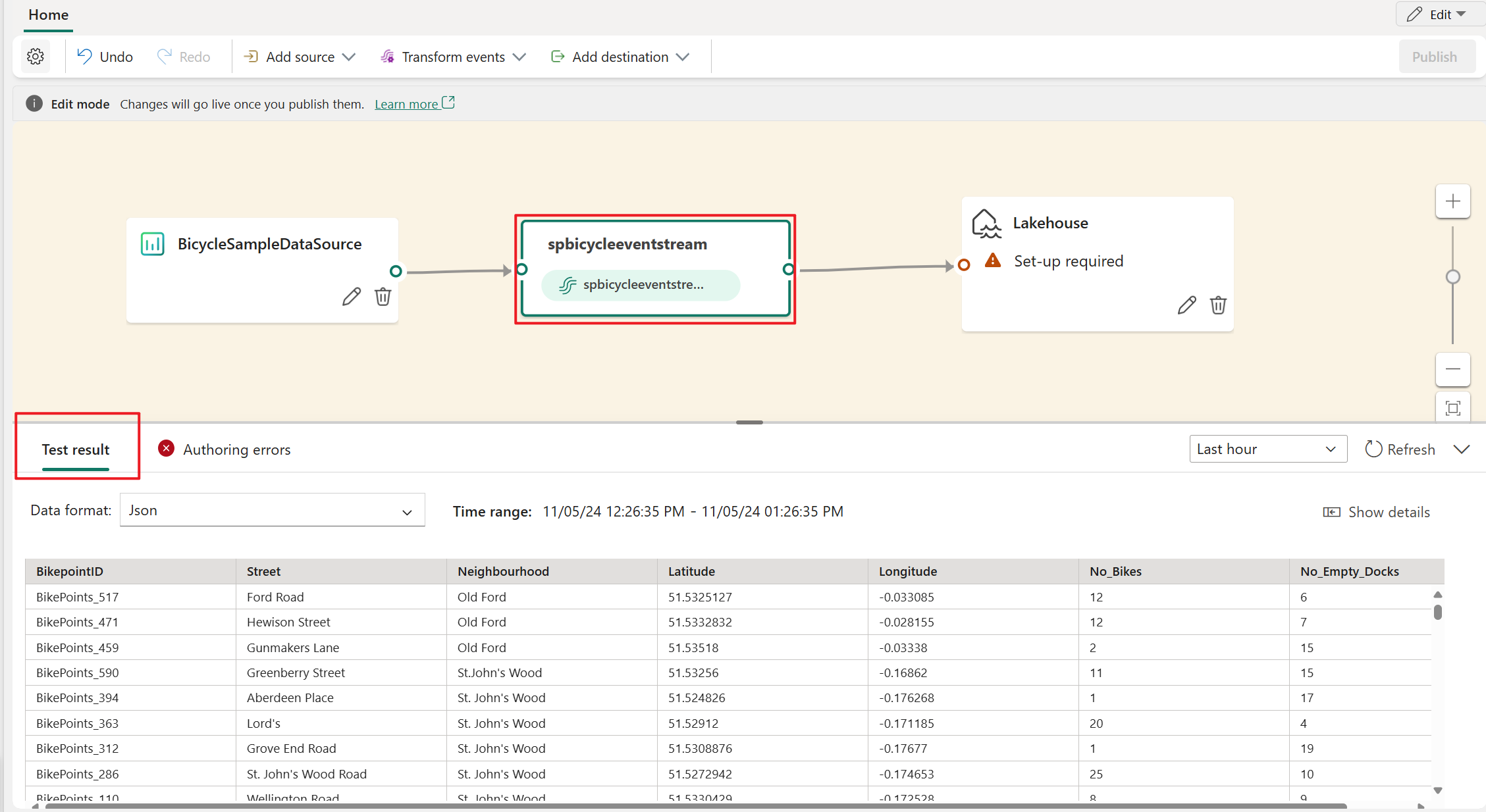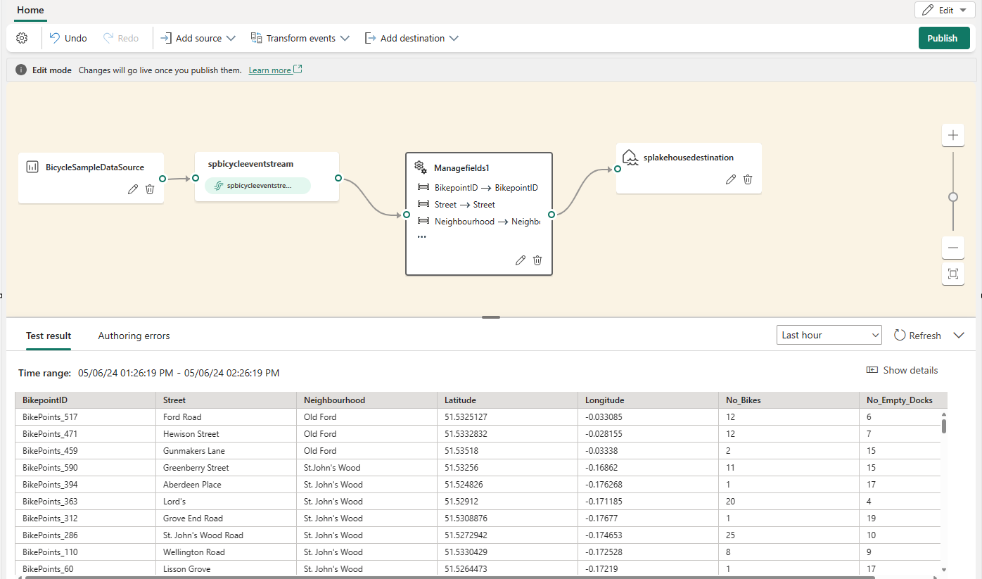 If your test result looks correct, select Publish to save the event processing logic and return to Live view.