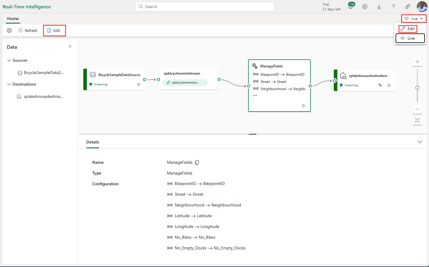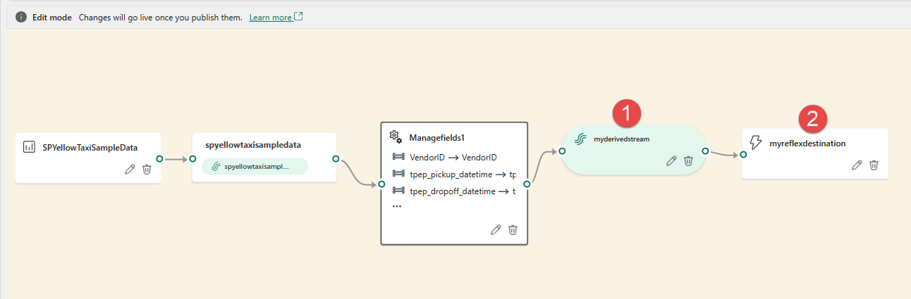 You can use the event processing editor (the canvas in Edit mode) to transform data into various destinations. Enter Edit mode to design stream processing operations for your data streams.