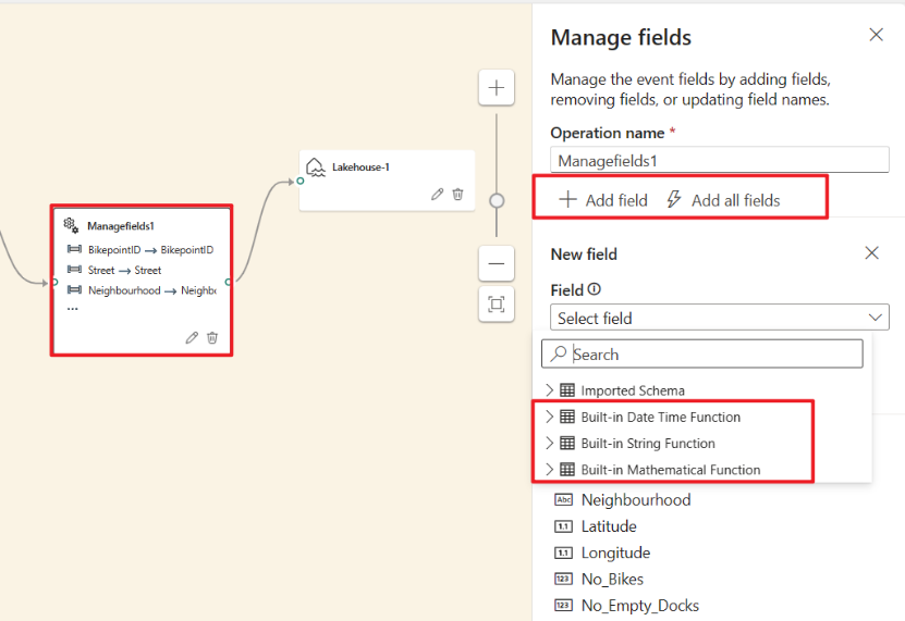 You can also add a new field by using the built-in functions to aggregate the data from upstream. Currently, the supported built-in functions are string functions, date and time functions, and mathematical functions. To find them, search for built-in.