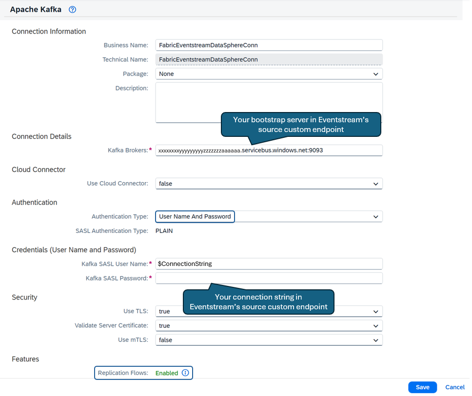 - Kafka SASL User Name: use constant value “$ConnectionString”.