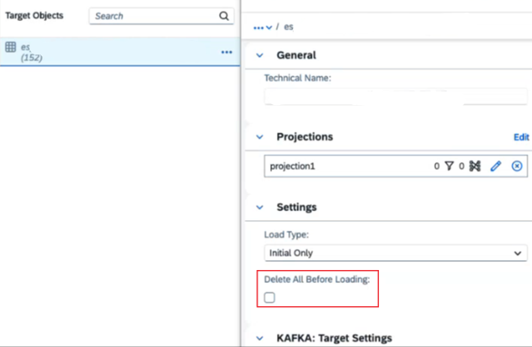 IMPORTANT: by default, the target object name will automatically be assigned according to the source object name. The target object name is the name of the Kafka topic that is to be created and receive the data from source object. Since the Kafka topic for receiving data in Eventstream already exists, it is critical to rename the target object name to the ‘Topic name’ shown in Eventstream’s source custom endpoint.
