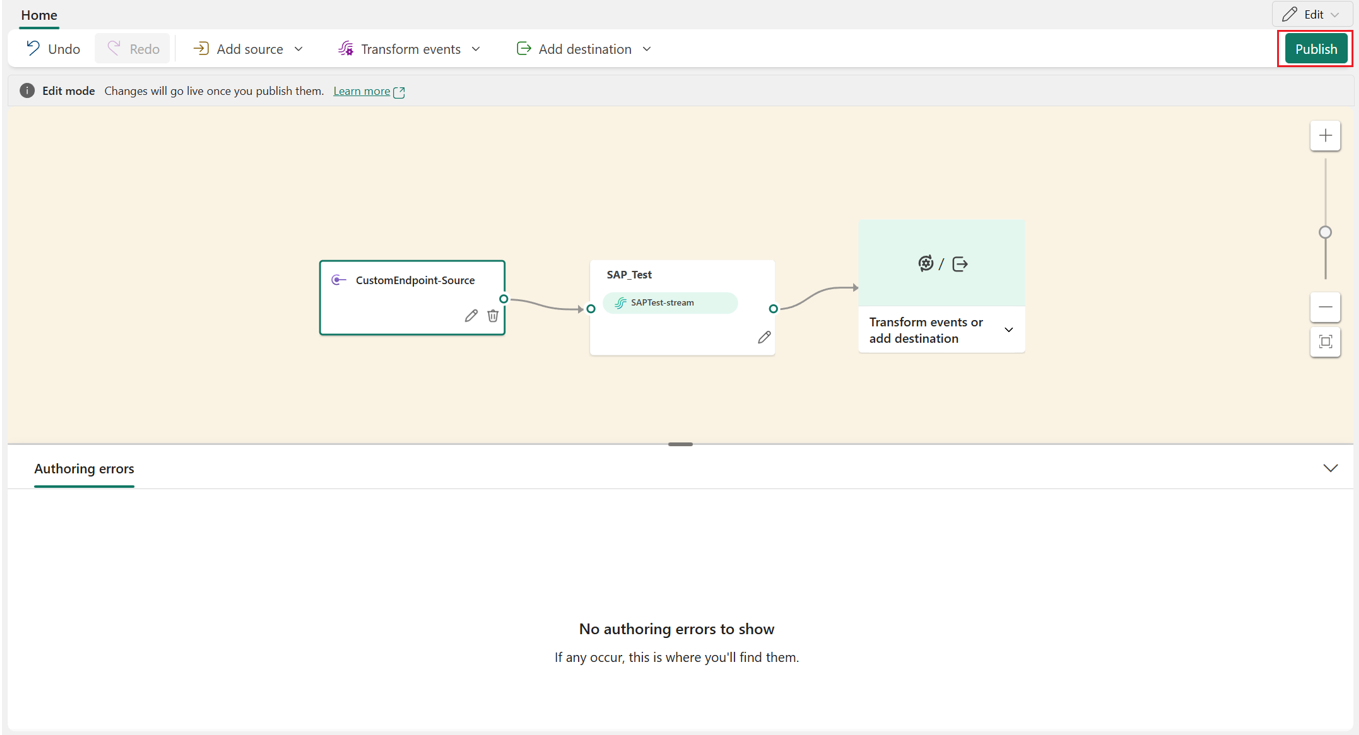After you create the custom endpoint source, it's added to your eventstream on the canvas in edit mode. To enable the newly added custom endpoint source, select Publish.