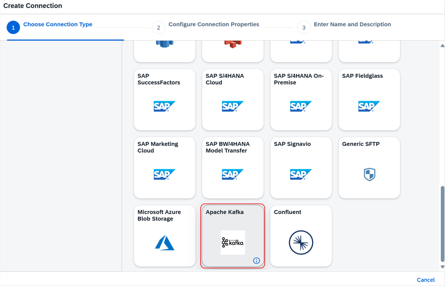 In the connection management tab of an SAP Datasphere space, select Apache Kafka connection type in the connection creation wizard: