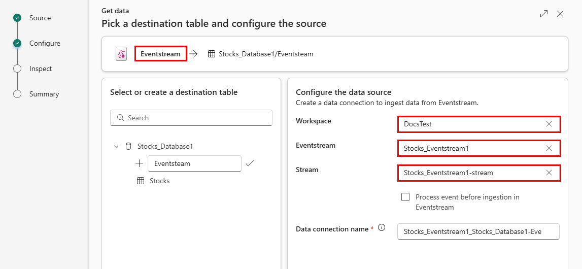 The Process event before ingestion in Eventstream option enables you to process the data before it's ingested into the destination table. With this option, the get data process seamlessly continues in Eventstream, with the destination table and data source details automatically populated.