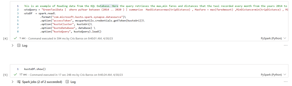 The rest of this workflow occurs in the Data Engineering section of the product, and uses a Spark notebook to load and query data in your KQL database.