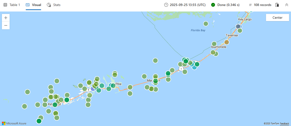 The following query finds nearby storm events that occur along a specified LineString, which represents a defined path. In this case, the LineString is a road to Key West. The geo_distance_point_to_line() function is used to filter the storm events based on their proximity to the defined LineString. If an event is within 500 meters from LineString, the event is rendered on a map.