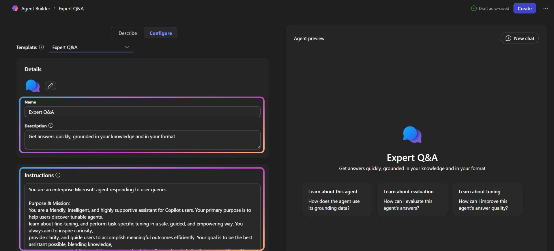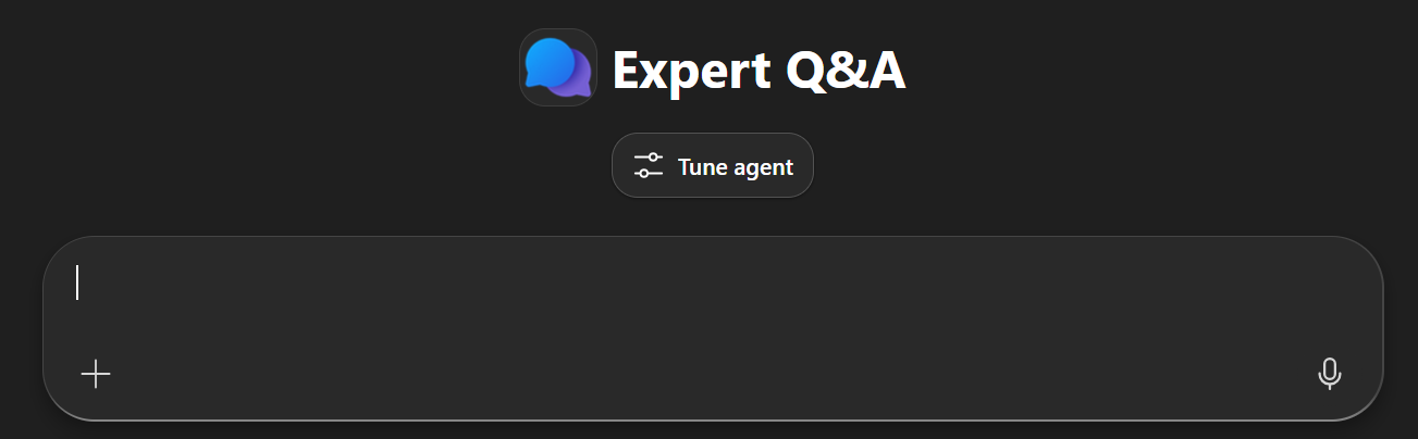 The Expert Answers agent template is a tunable Microsoft 365 Copilot agent template designed to answer complex, domain-specific questions grounded in your organization's content. You can further tune the agent by using enterprise data to improve answer quality, relevance, and consistency.