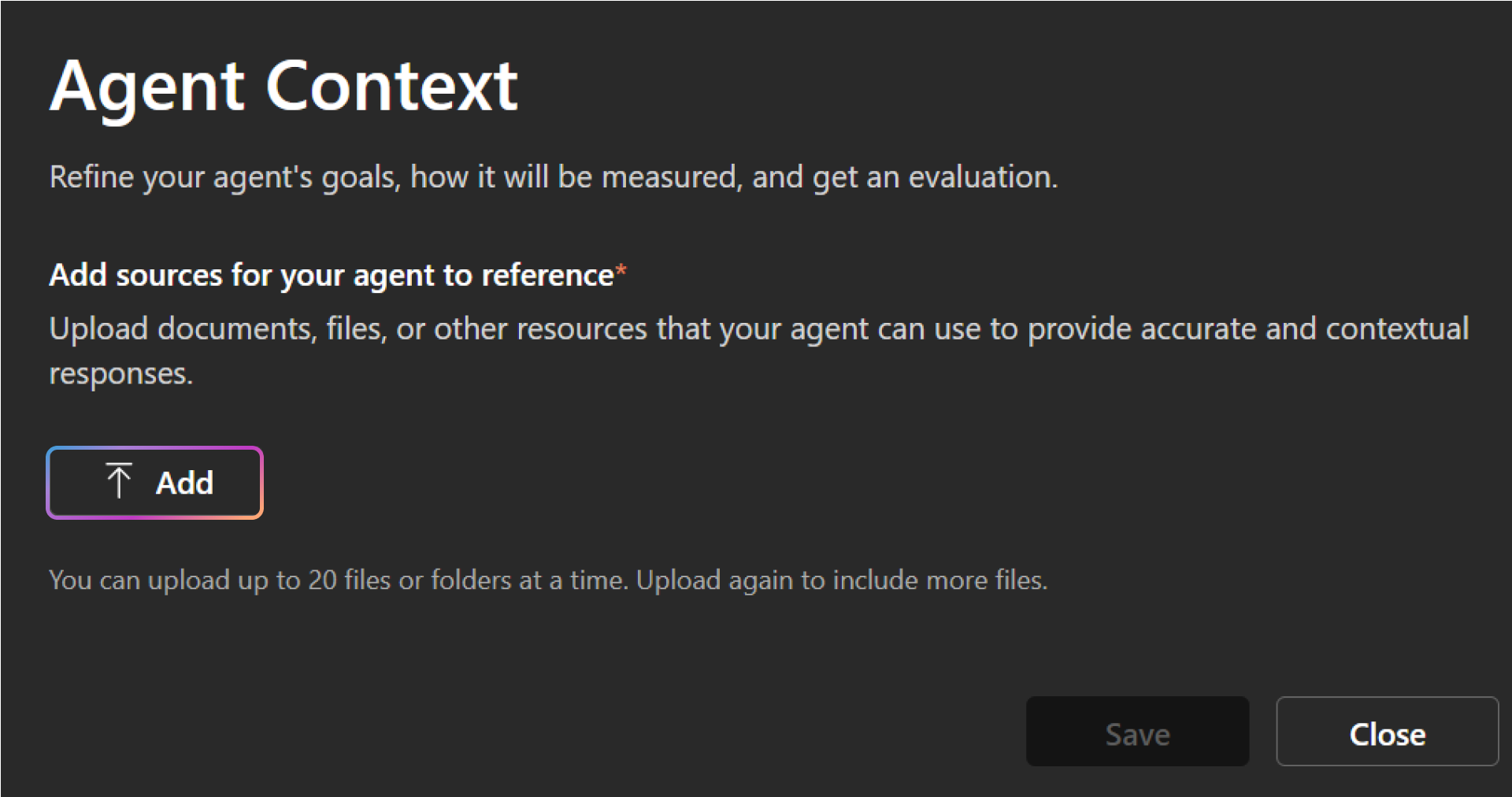 - You don't want to use declarative agent capabilities. In this case, don't add knowledge in Agent Builder.