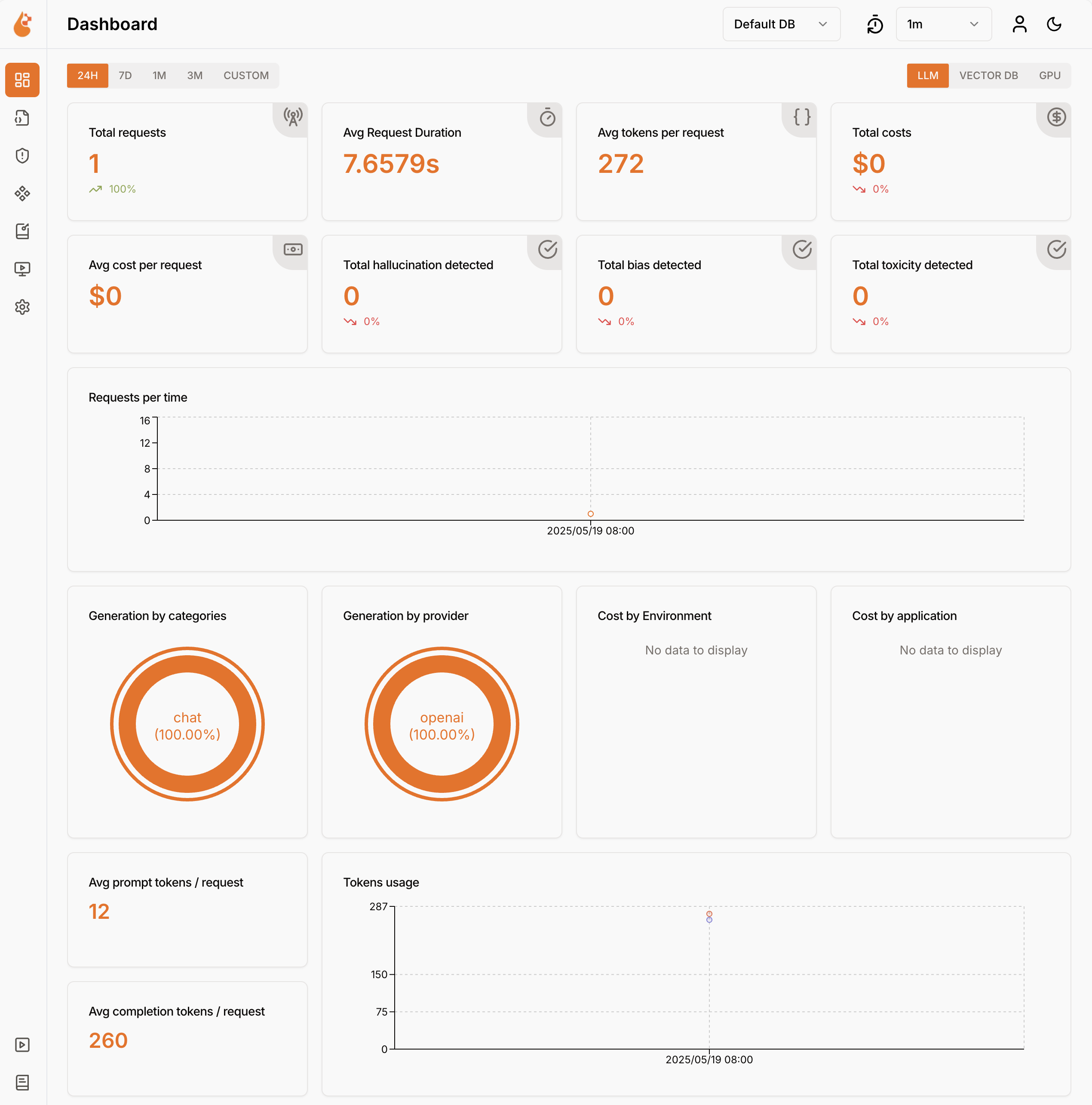 Dev Proxy logs language model usage data in OpenTelemetry format. You can use any OpenTelemetry-compatible dashboard to visualize the data. For example, you can use the .NET Aspire dashboard or OpenLIT. The telemetry data includes the number of tokens used in the request and response, the cost of the tokens used, and the total cost of all requests over the course of a session.