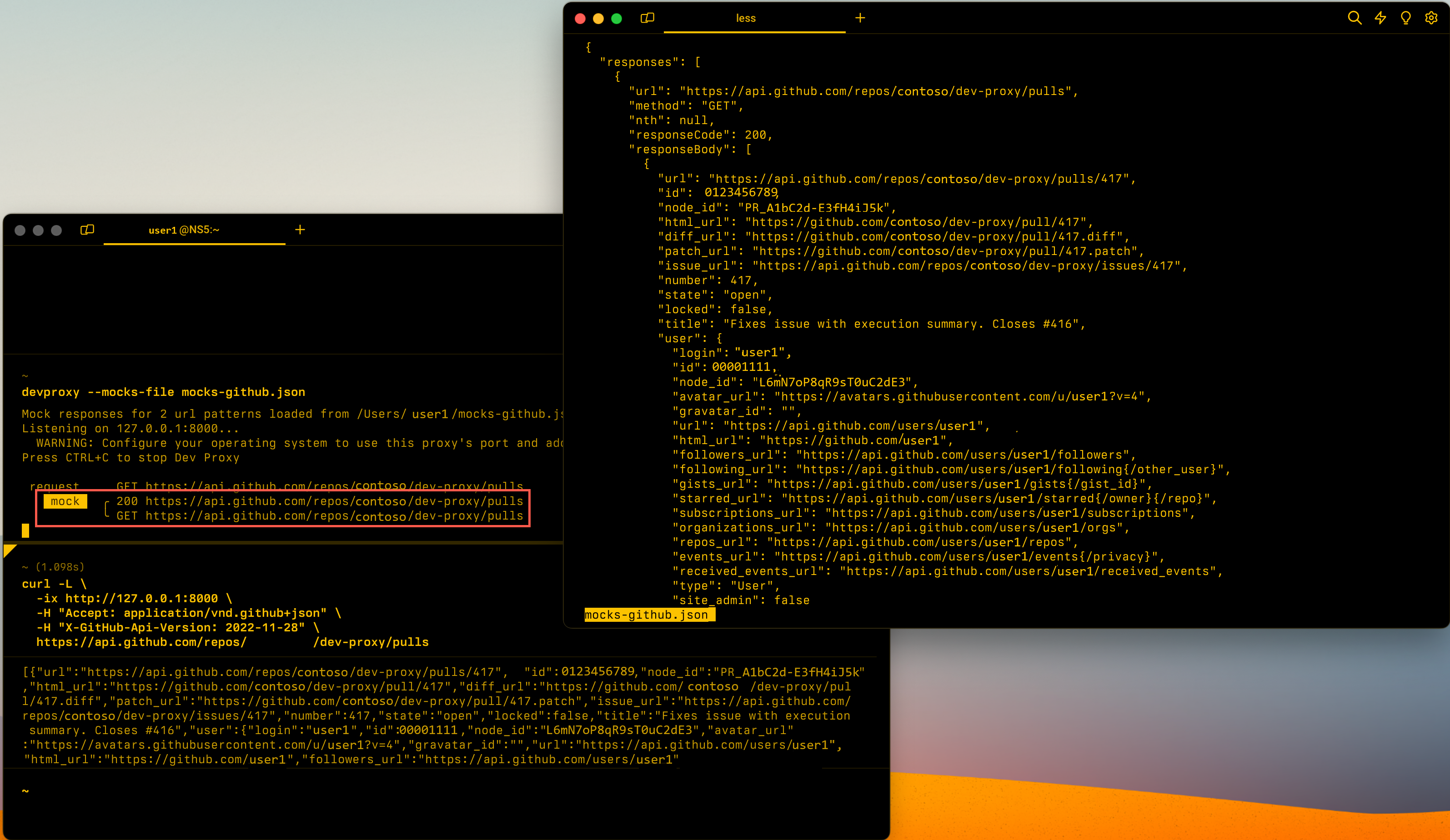When defining mocks, place the most specific mocks first. For example, if you have two mocks, one for https://jsonplaceholder.typicode.com/posts and one for https://jsonplaceholder.typicode.com/*, place the first mock first. Otherwise, Dev Proxy matches the second mock first and return the response for https://jsonplaceholder.typicode.com/* for all requests.