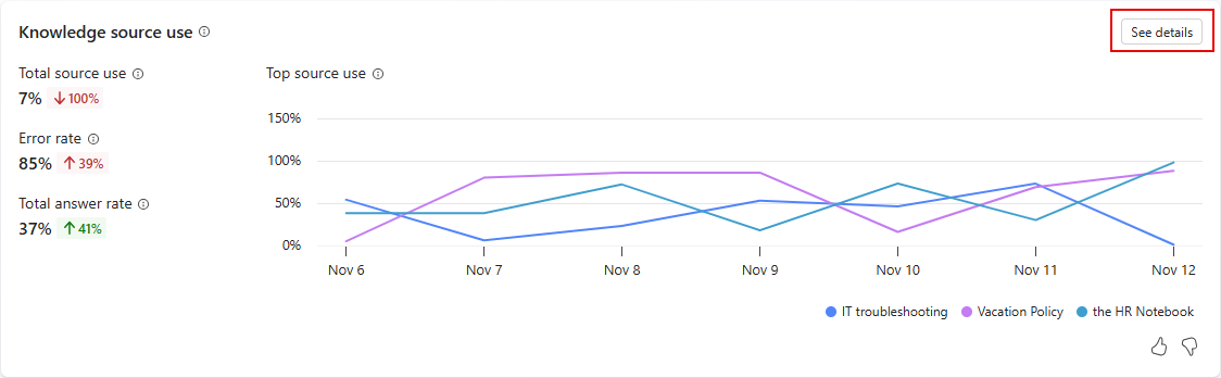 Select See details to open a side panel with knowledge source usage and error rates over your selected time period. You can use these charts to identify which knowledge sources work well to help users, and which to target for improvements.