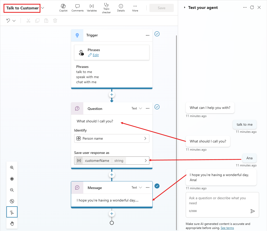 As shown in the test panel, if this topic is triggered first, it asks the user, "What's your name?" It stores the value in a string variable called customerName. The topic sends the message, "Pleased to meet you, customerName!" It then redirects to the Talk to Customer topic, which sends the message, "I hope you're having a wonderful day, customerName!" Note, however, that the Talk to Customer topic skipped asking for the user's name again. Instead, it used the value of the customerName variable passed from the Greeting topic.