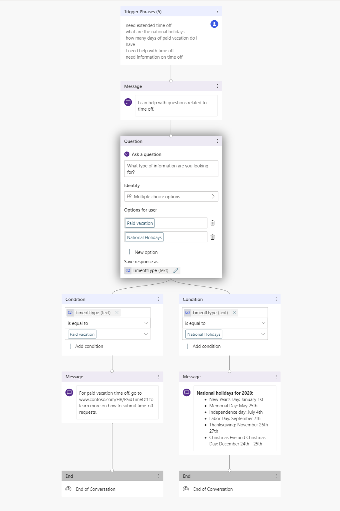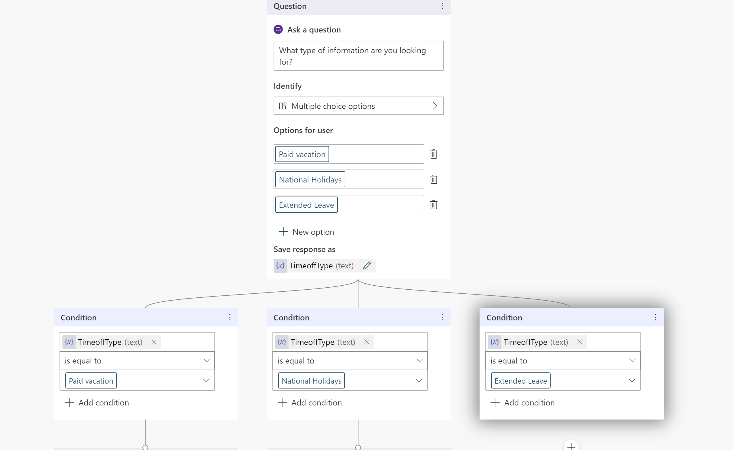 TimeOffType. Close the Variable properties panel and you see the changes reflected on the authoring canvas.You can add different responses for each option. For paid vacation, the chatbot can point employees to an internal HR website to look up paid time-off policies.