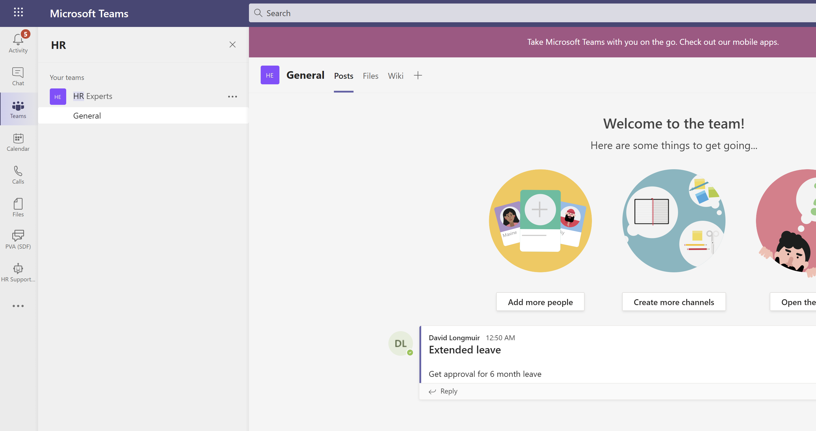 Once the chatbot is published, Contoso employees can access HR information in Teams without needing to search the company's intranet.