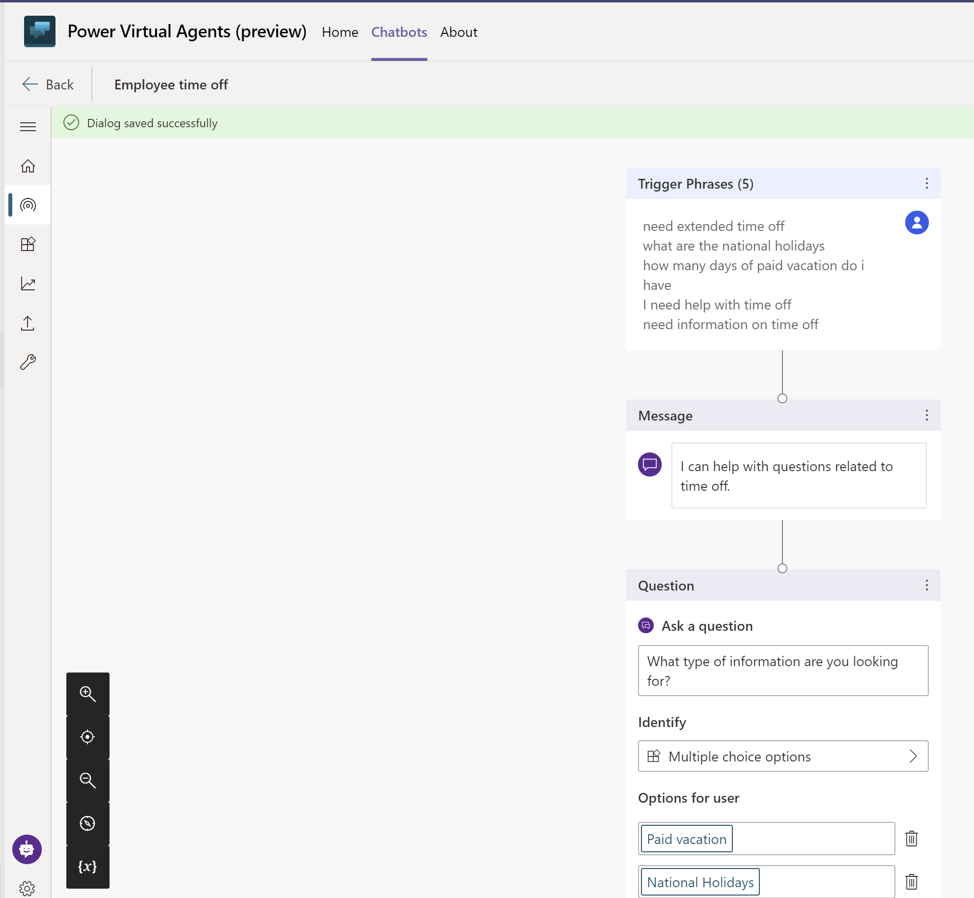 Copilot Studio comes with built-in natural language capabilities. You only need to define a few trigger phrases about time-off and the chatbot can accurately trigger the topic based on the employee's input.