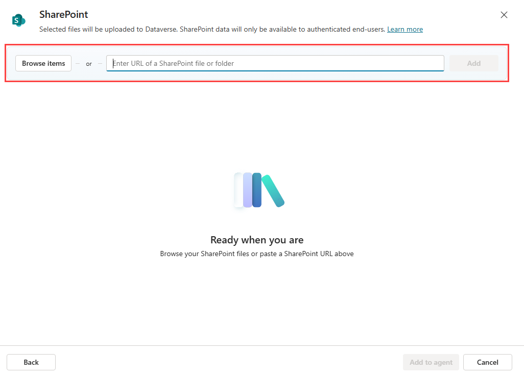 Screenshot of the Add knowledge dialog, after the SharePoint option was selected, highlighting the Browse items and enter URL options.