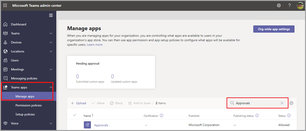 Screenshot shows the Manage apps page of the Teams admin center, showing the Approvals app.