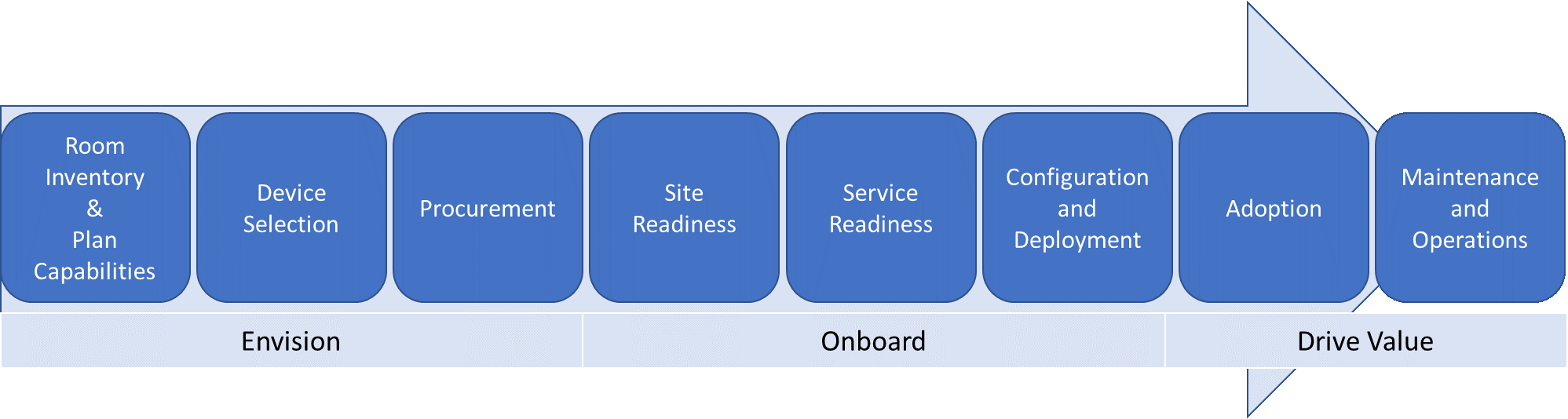Begin with understanding what conference rooms you have and envisioning what would work best for you in the future, then move through selecting and procuring the equipment you need, readying your sites, configuring and deploying your service, managing change and user adoption, and developing operations and maintenance procedures.
