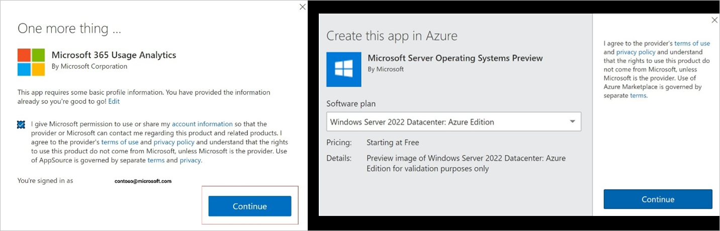 This number represents the count of Call to Action button clicks completed on the offer listing page (product detail page). Calls to action are counted when users select the Get It Now, Free Trial, or Contact Me buttons. Consent given represents the total count of clicks for customer-provided consent to Microsoft or the partner.