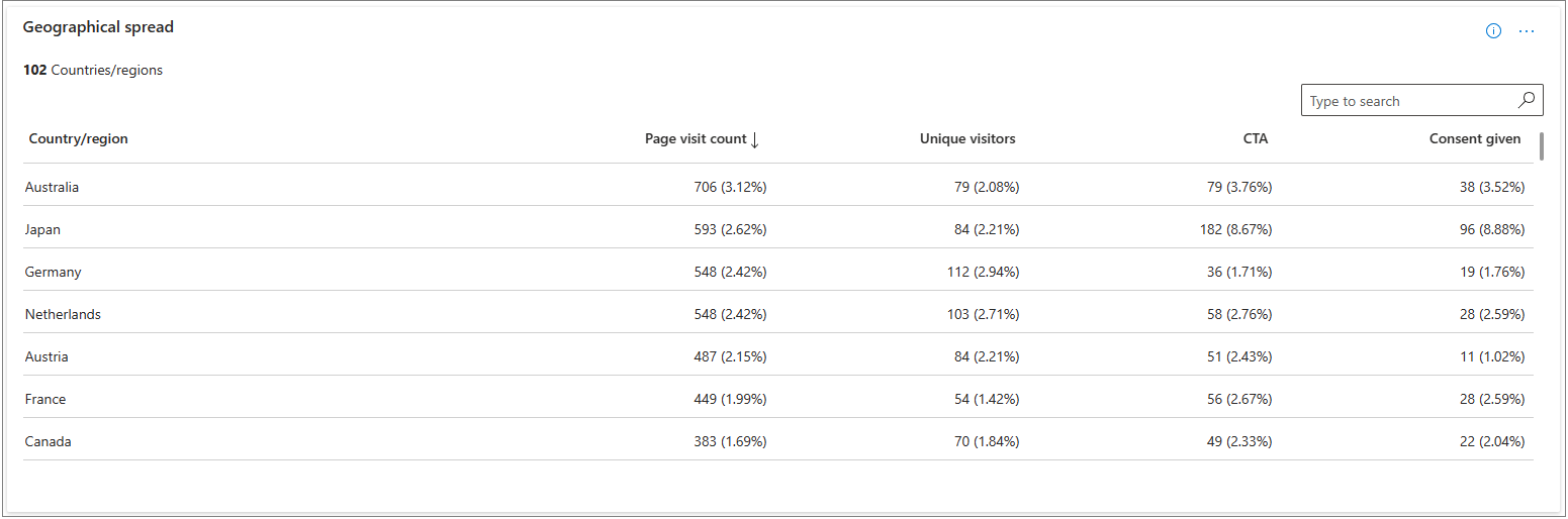 For the selected computation period, the geographical spread widget displays the count of page visits, unique visitors, and calls to action (CTA).