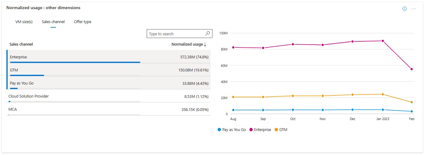 - Normalized usage by other dimensions: VM Size, Sales Channels, and Offer Types