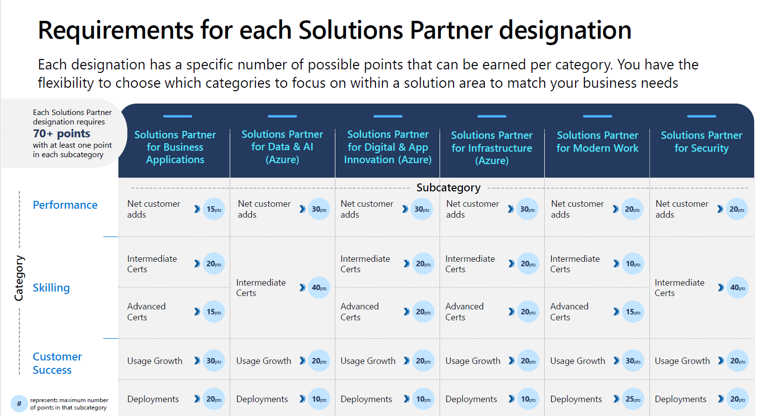 Each path has its own thresholds and qualifying criteria to earn points to qualify for a Solutions Partner designation.