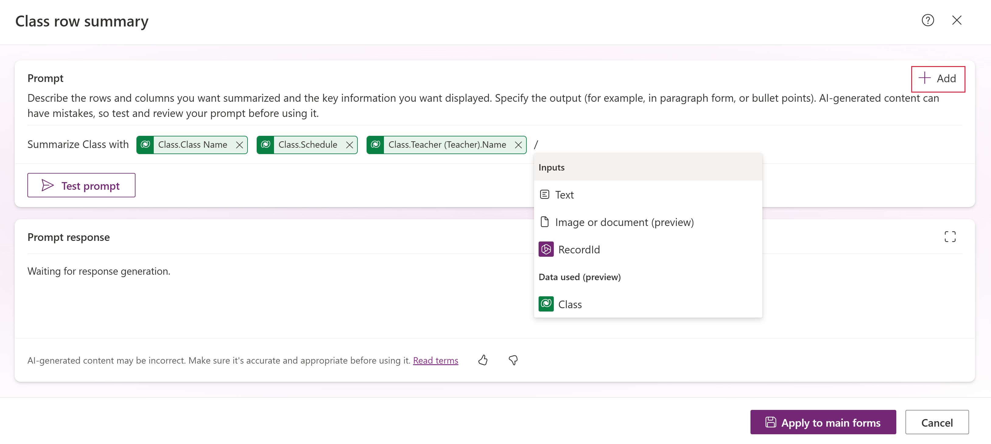 - In the Prompt box, add the columns that you want included in the summary by selecting Add or by typing /. You can also specify formatting for the summary, such as make it a bulleted list or a paragraph, as well as how to ensure the summary is generated in the user's preferred language. More information: Write a good prompt for the row summary