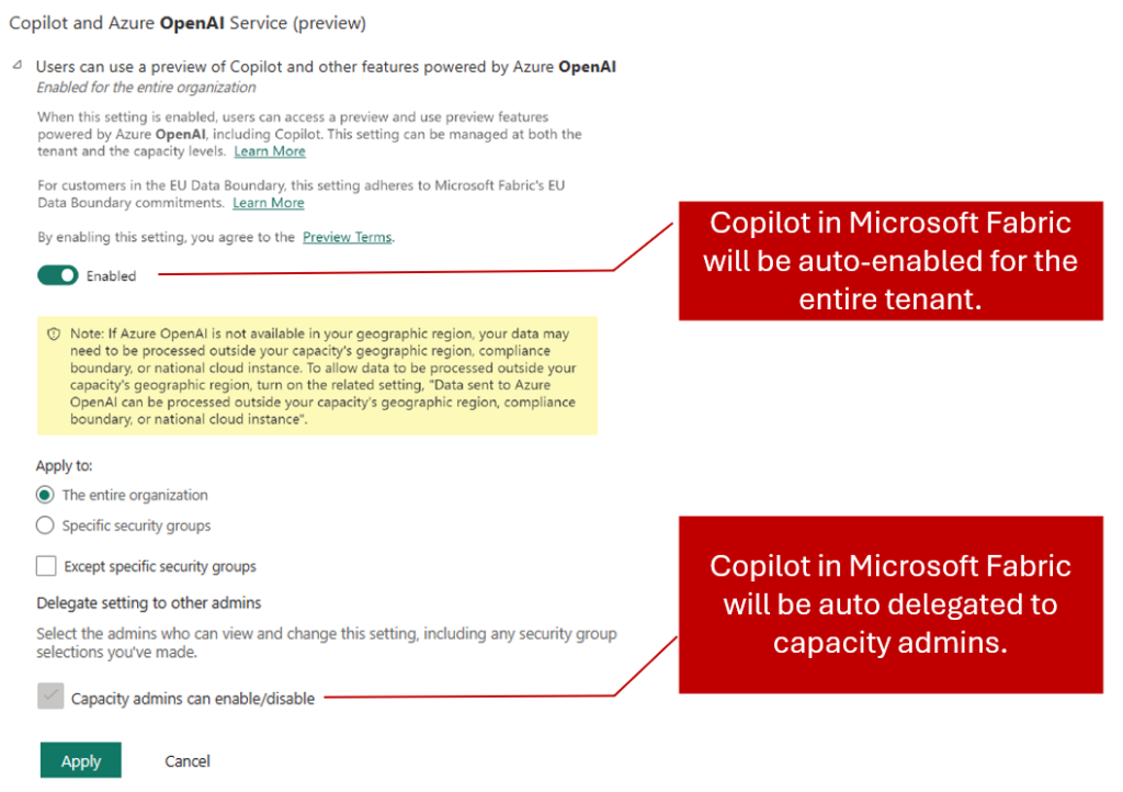 - If you're okay with your data being handled outside of your area, switch on the setting Data sent to Azure OpenAI can be processed outside your capacity's geographic region, compliance boundary, or national cloud instance, and select Apply.