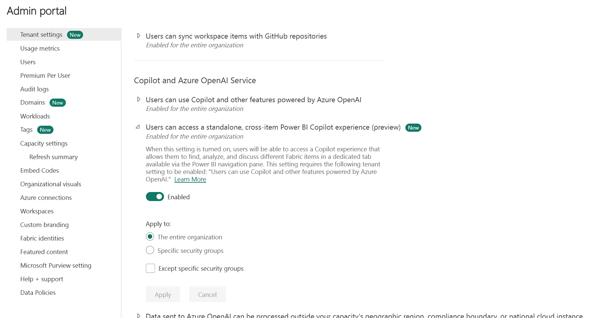 Within the Fabric Admin portal, the Copilot and Azure OpenAI Service settings control whether Copilot is enabled for your organization and who can access it. When you enable Copilot in Fabric, users can access Copilot across workloads. This access means Copilot isn't limited to a specific workload, like Power BI.