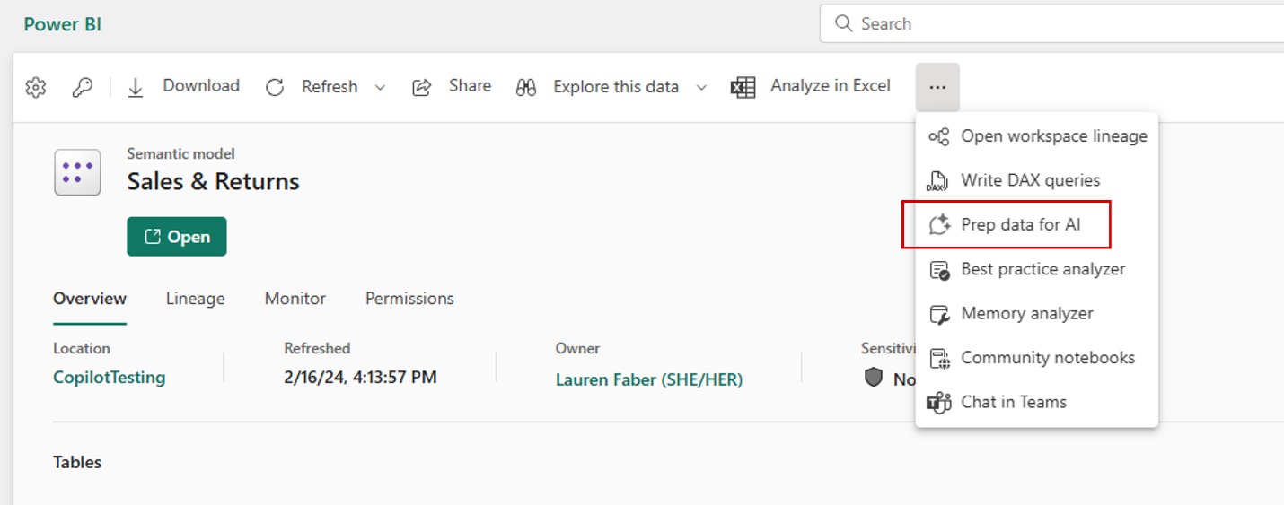 Screenshot of Copilot features in Power BI including the Prep data for AI options.