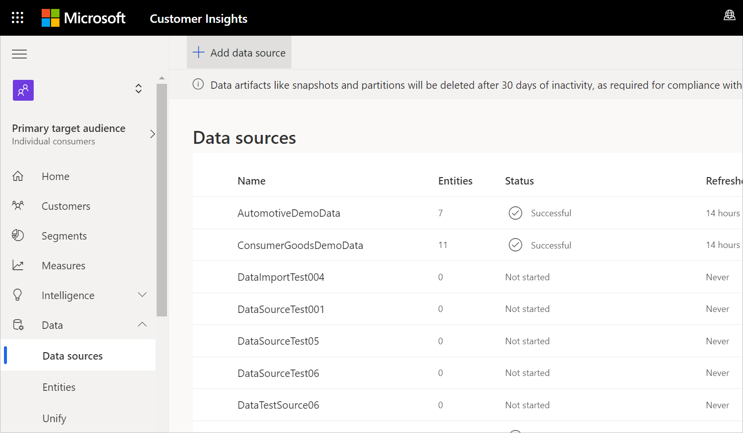 1. On the left side of Customer Insights, select Data > Data sources.