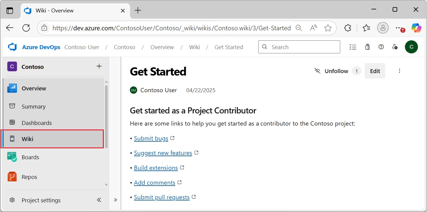| Project access | Member of the project where the wiki is located. If you don't have access, request it from your project administrator. Anyone with access to the team project can view the wiki, including Stakeholders. |