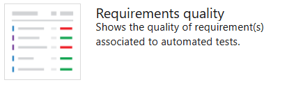 Configurable widget that you can use to track quality continuously from a build or release pipeline. The widget shows the mapping between a requirement and latest test results executed against that requirement. It provides insights into requirements traceability. For example, requirements not meeting the quality, requirements not tested, and so on.