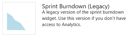 A team's burndown chart for a sprint to the dashboard. This widget is based on Analytics data. You have several configuration options for this widget, including selecting a team, iteration, and time period.